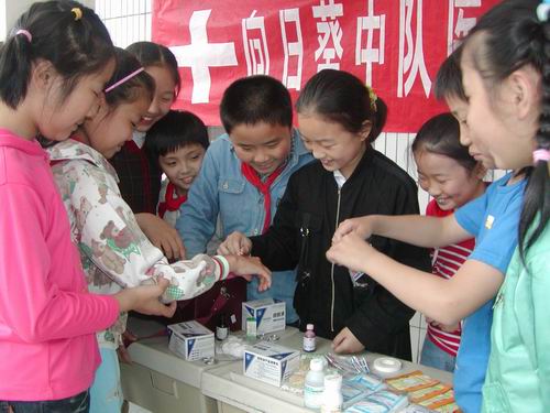[center](二)[/center] 在赛场的一角,四(4)中队的队员自发设立了“向日葵中队医疗服务点”,为在参赛过程中受伤的运动员清洗伤口,涂抹红药水。他们还精心制作了体育小报,宣传体育精神,与全校同学一起分享运动所带来的快乐。赛后,四(4)中队的队员高兴地说:“虽然我们没有四连冠,但我们收获得更多。我们拥有了冠军的胸怀,用实际行动证明了我们对冠军的追求。我们无私地帮助了同学,使更多的同学加入到冠军的行列中,我们的付出是值得的!”的确,他们成为了本届运动会上一道最靓丽的风景线。