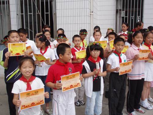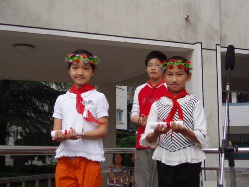 在韩红《感动中国》荡气回肠的歌声里,孩子们自豪地登上了领奖台。老师们声情并茂地宣读了颁奖词,亲手递上了红艳艳的证书,并给他们戴上了美丽的花环……