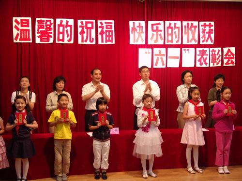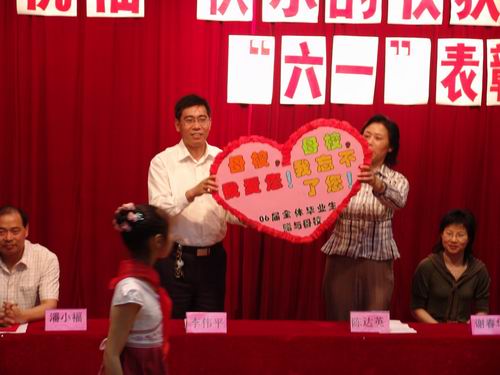 “六一”节的庆祝活动在“温馨的祝福,快乐的收获”“六一”表彰会中拉开了序幕。这次被表彰的不光有“优秀少先队辅导员”“优秀少先队干部”“优秀少先队员”,还有在各级各类比赛中获奖的学生,更有在艺术节中参与率高的班级和表现出色的孩子。最令全校师生感动的是,六年级学生在毕业前夕,给母校送上了自己制作的心意卡。那张心意卡被精心设计成了心形,正面书写着:“母校,我爱你!”“母校,我忘不了你!”几个红艳艳的大字;反面是六年级学生的签名。当几位六年级的孩子把心意卡赠送给李校长和陈书记的时候,全校爆发出热烈的掌声。温馨感人的表彰会在李校长的祝福声中结束了,同学们在这个活动单元里收获了成功,收获了感动……