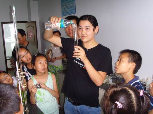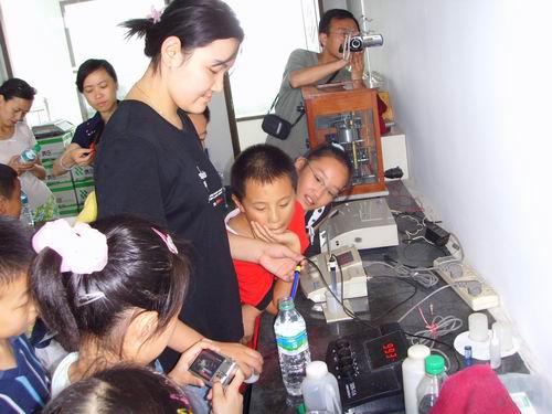 最后同学们来到了实验室看着实验员阿姨进行了原水与纯净水的电导率、硬度的对比实验。国家规定的纯净水电导率小于10,同学们看到了两天前生产出来的纯净水电导率是2,而原水的电导率是911,就不再怀疑纯净水中的绝大多数微量元素已经被过滤掉了。同学们边看边听,边看边问,不知不觉过去了一个多小时,这才依依不舍地离开。