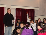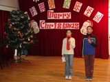 中午一个小时的互动时间一眨眼就过了,同学们还真有些意犹未尽呢。别急,我们精心准备的“圣诞大餐”马上就要来了。在英语老师演唱的do-re-mi的歌声中,我们开始了今天的圣诞演出。紧接着,学生们的注意力一下子被外籍教师的声音吸引住了,大家竖起了耳朵,努力地试图听懂她说的英语,哦,原来她在给我们介绍圣诞节的由来。终于轮到我们熟悉的小伙伴闪亮登场了,他们可不是等闲之辈,各各都是过五关斩六将,从班级,年级选出的高手呢。美籍小选手汪乔治一说英语就把在场的大哥哥大姐姐都给震住了,不过,我们本国的同学也一点都不逊色呢!瞧,四年级的刘菁和邹雨沁、六年级的曹真一也绘声绘色地为我们表演了两则精彩的英语故事。听完故事就来欣赏一段歌曲吧,这儿有抒情版的《fly girl》,还有动感十足的《a little bird&you’re my sunshine&do-re-mi》的歌曲联唱。高年级的同学将会场上的气氛掀入了高潮,他们表演了小品剧《five monks》《a telephone call》以离奇的剧情、滑稽的动作、幽默的语言把在场的同学逗得哈哈大笑。他们的配音表演《shark tale》也征服了在场的所有老师和学生。在幕后精心排练、悉心辅导的英语老师Miss Wang和Miss Chen也走到了台前,分别以一曲《God is the girl》和配乐诗朗诵作为圣诞礼物献给了大家。