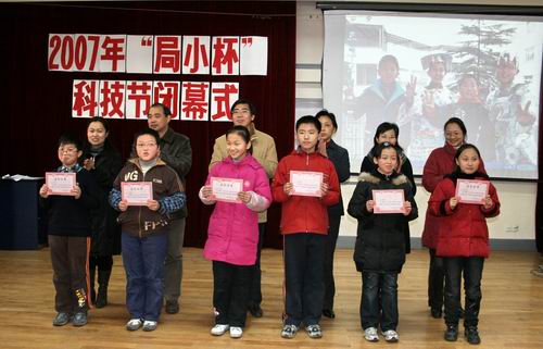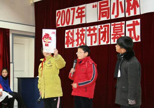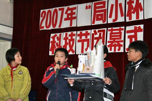 元旦来临,我校举行了隆重的2007年“局小杯”科技节闭幕式。闭幕式上,全校师生首先收看了本届科技节中一系列活动的花絮,然后各年级废品利用系列活动中的金牌获得者,向大家作了作品介绍。他们讲出了对科学的热爱,讲出了自己作品的创作意图,更是讲出了对未来科技的畅想。六年级的纸衣展示,不仅是对各种废旧物品的再次利用,更是对绿色奥运的一种诠释。一样样废旧材料在一双双灵巧的小手下,变魔术般地成了房子、小动物、面具、剪贴画、建筑、漂亮的衣服。同学们在介绍的过程中,尤其强调他们的作品不是一个人的功劳,而是一个团队的杰作。一个个生动有趣的介绍,一个个作品的精彩亮相,得到了师生一次次发自内心的掌声。最后,杜英姿主任宣布了一(4)班 、二(5)班、三(5)班、四(1)班、五(3)班 、六(6)班获得2007年“局小杯”科技节团体第一名的佳绩和十个局小“科学小院士”的名单,学校领导为获奖的班级和同学颁发了证书。