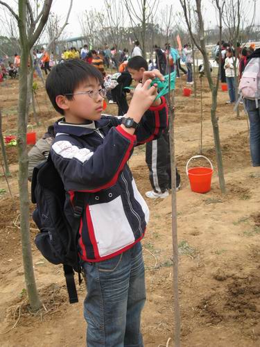 梦想放上了天,接着就该种下绿色的希望了。挖坑,培土,浇水……我们一点儿也不比园丁们差,不一会儿,一棵棵小树苗精神地站了起来,它们仿佛在说:“我们在长高!”。今天,我们种下棵棵树苗,明天,它们会长成参天大树,看到它与我们一齐成长,那是多么惬意的事啊!
