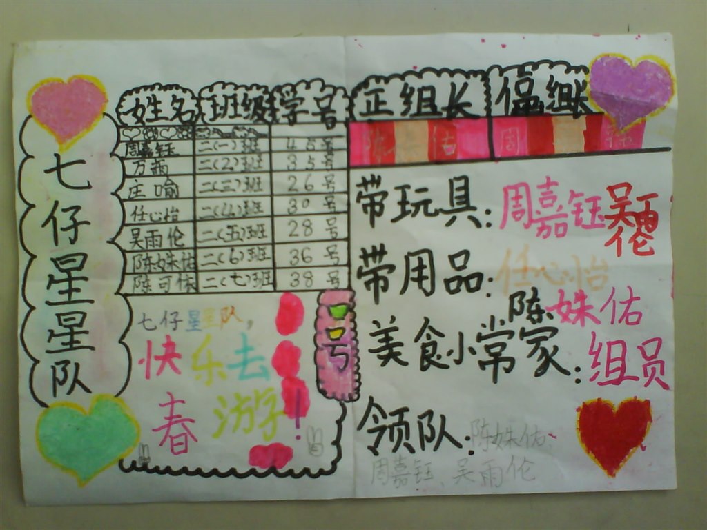 二年级的孩子们组建了假日小队,人员自由组合。有了自主权,孩子们的创造力便立刻发挥出来。他们像模像样地招兵买马,成立小队。人员定好,他们便坐在一起商议小队队名,设计小队标志和宣传口号,忙得不亦乐乎。一切准备就绪后,他们又立刻进行详细的分工:小小服务员负责带餐布、垃圾袋;小小营养师负责协调分配所带食物;小小监督员负责管理纪律;小小设计师负责设计在草坪上的游戏……呵,这些富有童趣的小职位还真是我们老师没想到的。进行了细致的分工后,各小队又制定了详细的安全与文明公约,一切准备就绪,满心期待着春游的到来!