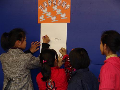 在3月19日红领巾电视节目中,四年级各班同学组成的“友情护书小组”分别向同学们谈了自己的护书心得:有的谈对循环用书的看法;有的介绍护书卡的设计与制作;有的讲述身边的护书故事;有的畅谈护书经验。在浓浓的护书气氛中,学校大队部向全体龙娃发出了倡议:让我们在共用的书上制作并张贴“友情护书卡”,签下我们每个人的名字,然后用我们的爱心行动共同爱护这本书,做到“三个不”:不在书上乱涂乱画,不损坏书页,不翻卷书页的角落。在护书行动开展之后,大家还可以通过“护书排行榜”来比一比,哪一个友情组做得最好?