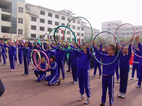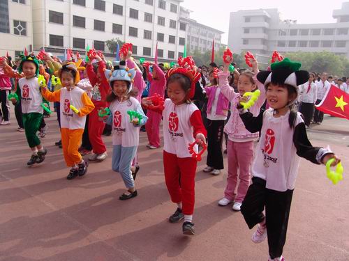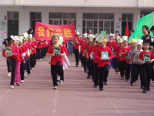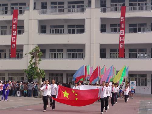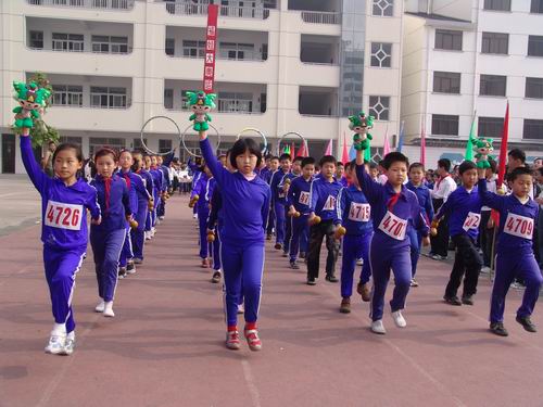 上午8:30,入场式准时开始,各个年级以年级组为单位,整体设计入场仪式。一年级的红领巾小龙娃就像可爱的小福娃,带着“北京欢迎您”的祝福第一个把快乐带到了绿茵场上。二年级的奥运明星代表队也不甘示弱,小姚明、小刘翔、小杨扬等用火热的拼搏激情把校园点燃。接下来,操场上飘起了各式各样的世界国旗,难道是五洲四海齐相聚?原来是三年级的世界联队,五大洲的小选手们在五星红旗下紧紧相拥。果然在红旗的召唤下,四年级的火炬队伍带着龙娃们的祝福飞奔而来。五年级龙娃挥舞着球拍、呼啦圈等各种运动器材迎面走来,舞出了对运动、对生命的热爱。最后,六年级的小龙娃们在锣鼓声声中,整装待发,精神饱满,以洪亮的声音喊出了在母校度过最后一次小奥运的激动与留恋。