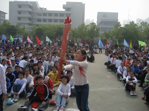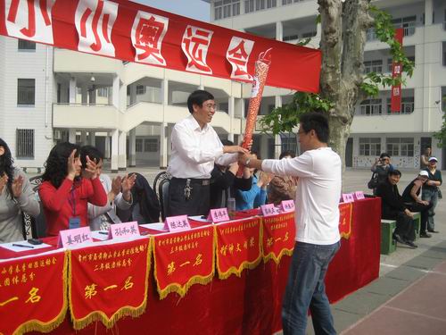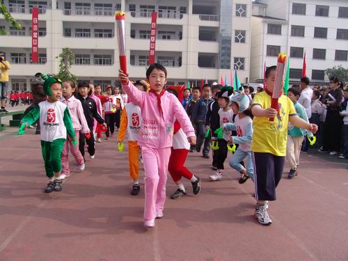 当所有的小龙娃都聚集在操场上时,庄严的火炬传递仪式开始了。小龙娃自主成长领航团团长邵一洲同学第一个举起了火炬,随后,火炬在各个班级前期选出的火炬手之间传递,孩子们激动的表情,操场上激昂的音乐,俨然就是奥运圣火来到了局小。当小小火炬传递到各个年级选出的教师代表手中时,孩子们欢呼雀跃,把整个开幕式的气氛推向了高潮。最后,小奥运的总指挥王浩老师把火炬交到了李校长手中。李校长郑重地把火炬高高举起,宣布“2008年局小小小龙娃奥运会开幕”。