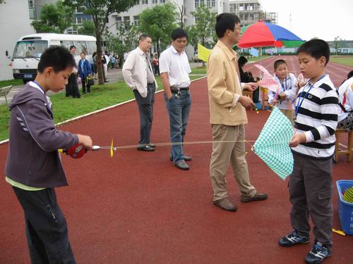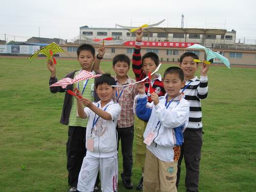 在2008年常州市小学航空模型比赛中,我校学生冒着淅沥的小雨,顶着大风,把模型飞机一次次掷向蓝天。最后,在全市三十多个学校近150名学生中,三名学生脱颖而出,四(5)班毕森同学获得了P1B-0“天池”橡筋动力模型飞机一等奖,五(1)班陆思远获得了P1Y“中天”橡筋动力伞翼模型飞机二等奖,五(1)班章乐水获得了P1B-0“天池”橡筋动力模型飞机三等奖。