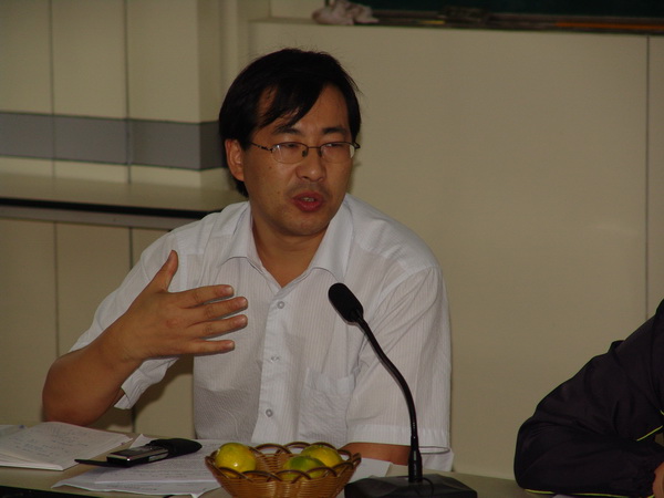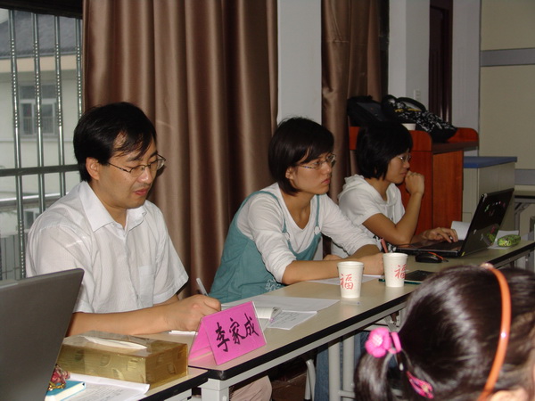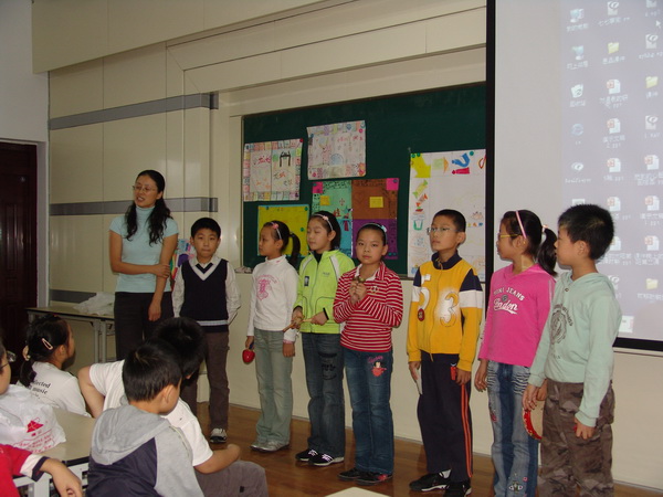 基于2009年是祖国建国六十周年的大背景,学校把爱国主题渗透到本学期的所有活动中,其中的主打活动就是与读书节进行整合后的“读红书画红棋”活动。今天的两节研讨课就是主打活动在班级层面的表达。一(3)班的王奕老师带着刚入学不久的50名新龙娃开始了《校园翻斗乐》。王老师从孩子们熟悉的校园一角切入,开展了“小画家行动”,然后借助拼音的游戏情境带领孩子了解一些不为他们所熟悉的地方,激发学生对校园的归属感和自豪感。在此基础上,王 老师又引导孩子在游戏中关注文明礼仪,为孩子们良好的集体生活打下基础。四(6)班的冯静燕老师则从中年段学生的发展需求出发,与孩子们一起《亲亲我的龙城》。孩子们从“家乡的老桥”、“家乡的老巷”、“家乡的学校”、“家乡的小吃”、“家乡的名人”、“家乡的风景”六个主题切入,介绍了自己的调查结果,抒发了对家乡的热爱之情。随后,大队辅导员许嫣娜老师介绍了三年来学校对于国庆节的整体序列全程策划,对这两堂课的背景做了补充性互动。