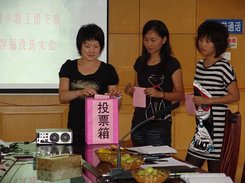 经过公正透明的选举程序,当场选举,公开唱票,推选出陆虹伊、杨茵雯和顾雄三位老师为新一届团委委员。会后,团支委们又进行了分工:陆虹伊为新一届团支部书记,顾雄任组织宣传委员,杨茵雯任文体委员。