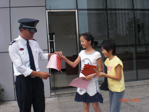 为了开展“红旗飘飘”行动,周五,我们辛勤地做着红旗。周六,我们来到了大街上。老远就看到正在烈日下站岗的保安叔叔,他们多么辛苦啊!我和孙亦清不约而同的快步走上去,迎接我们第一个“客人”。“保安叔叔您好!过几天就是我们祖国六十岁的生日了……”“哇!你们做得真好!谢谢!你们太有创意啦!”保安叔叔满怀激动地收下了国旗和国旗法。我们好开心!是啊,在我们传递爱心的时候,也希望天下所有中国人永远热爱自己的祖国,就像那燃烧着红色火焰的五星国旗!(谢轩)