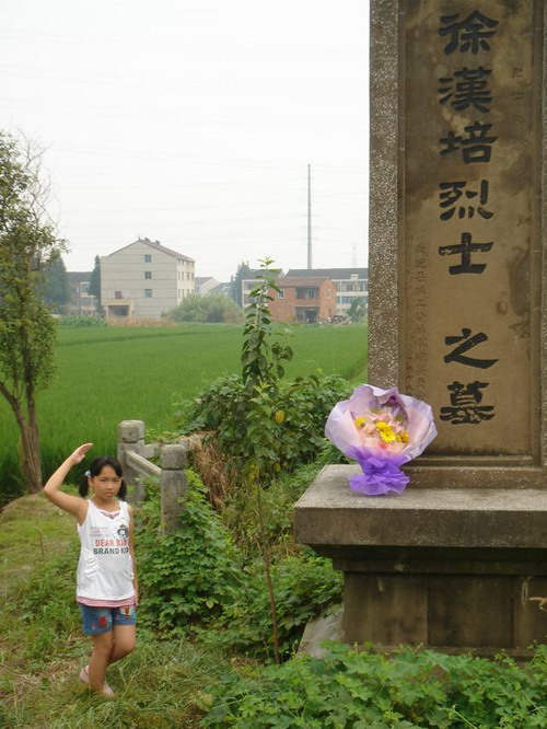 我寻访的烈士叫徐汉培,他是我外婆家的远亲。徐汉培生于1918年,是武进坂上乡升东徐家村人。那时马杭有个投靠日本人的大汉奸,人称王麻子,他仗着日本人无恶不作,横行乡里。王麻子很怕积极抗战的徐汉培,把他视为“眼中钉,肉中刺”。他唆使叛徒趁徐汉培睡觉之际向他射出了罪恶的子弹,徐汉培牺牲时年仅26岁。