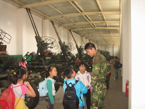 二年级的龙娃们在教官的带领下参观了国防园,小朋友们看在眼里的是锃亮的手枪、机关枪,摸在手里的更是沉甸甸的喜悦。他们想象着能当上解放军,手握钢枪、保家卫国。拉开卷帘门,一排大炮整齐地展现在大家眼前,高高的炮筒直指天空,龙娃们摸摸这里,转转那里,这些可都是真家伙!恰逢有一批中学生在练习队列,大哥哥大姐姐迈着整齐的步伐,喊着响亮的口号,雄赳赳的气势感染着在场的每一位龙娃……