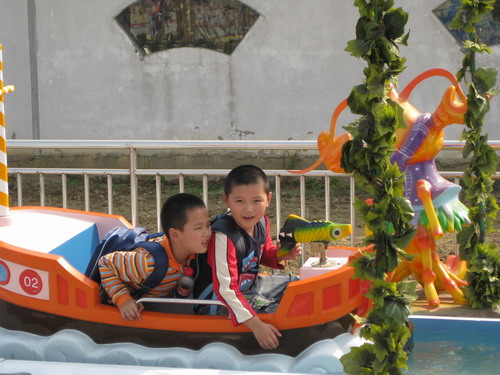 六年级的龙娃们来到了天目湖风景区。他们呼吸着新鲜的空气,走过茂密的竹林,参观了古老的“状元楼”,走进了奇妙的海底世界,体验着刺激的动感电影。浓密的绿树、清碧的湖水、层叠的山峦、爽朗的笑声……徜徉在自然山水间,每个龙娃的快乐心情都伴随着秋风飞扬。在田园区的两架大水车上,龙娃们纷纷趴在横木上,喊着“一,二,三”的劳动号子,奋力踩动着水车,刹那间,清澈的湖水通过一条小渠,浇灌到田里……