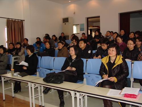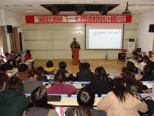 赵老师的漫谈式讲座让在场老师感到了轻松和愉悦。讲座初始,赵老师以笑容为幸福的测量标准,在老师中间开展了有趣的调查互动。以此为契机,赵老师引出了心理健康的话题。他向在场教师显示了一些调查数据,指出教育的真义是使人幸福,教师的心灵成长要从自身的心理保健开始,教师要成为能有效并积极影响学生的人等等。同时,赵老师和老师们共同探讨了如何成为阳光型教师的策略,给予了大家一些有效建议,例如一些心灵修炼的策略以及一些情绪管理的策略等。最后,赵老师和大家展开了热烈的互动,就一些老师中存在的困惑进行了探讨。
