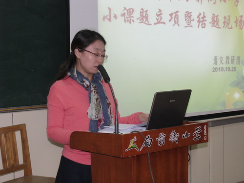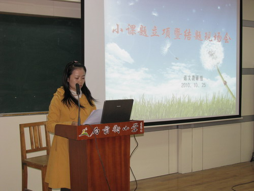 接着进行的是吴梦涛老师小课题的结题工作。吴老师先作了10分钟的课题总结,展示她的研究成果。然后,金东旭主任从针对性、过程性、本体性等三方面肯定了吴老师的课题所取得的成绩。