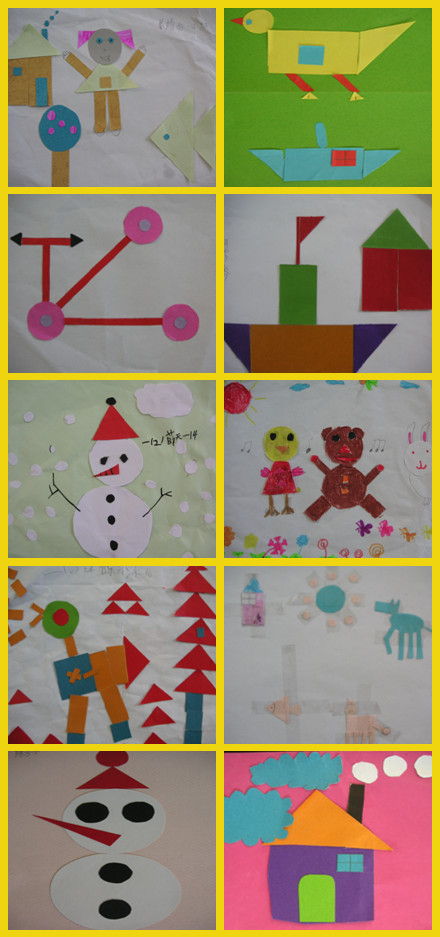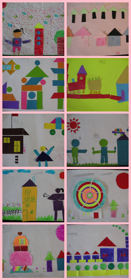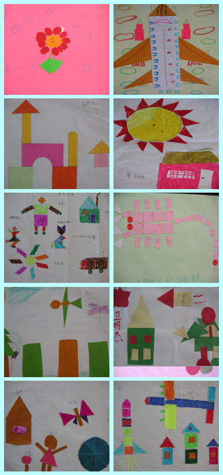 孩子们还利用课余时间剪出大小不同的各种图形,涂上不同的颜色,拼出多种美丽的图画,体验着数学特有的美。