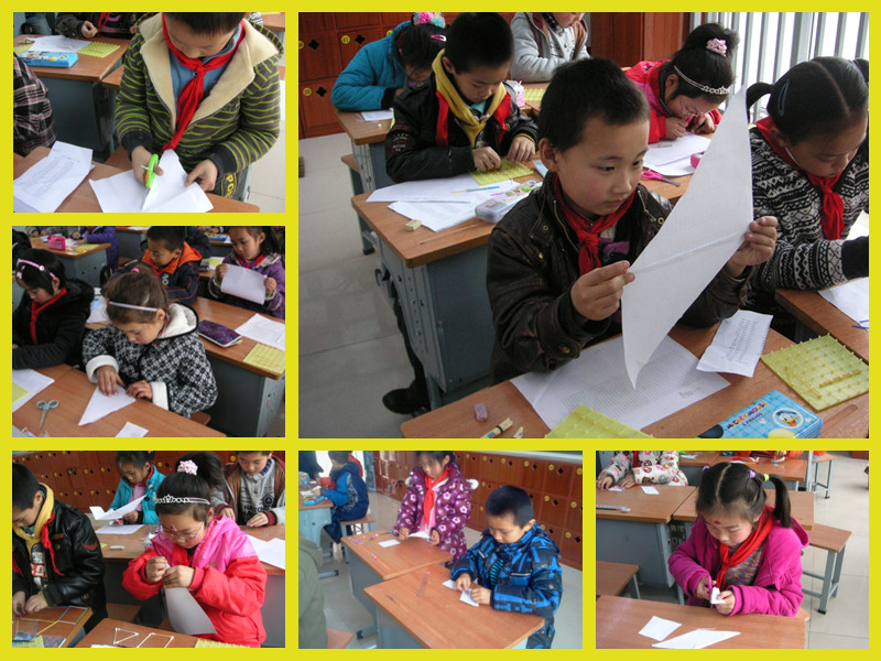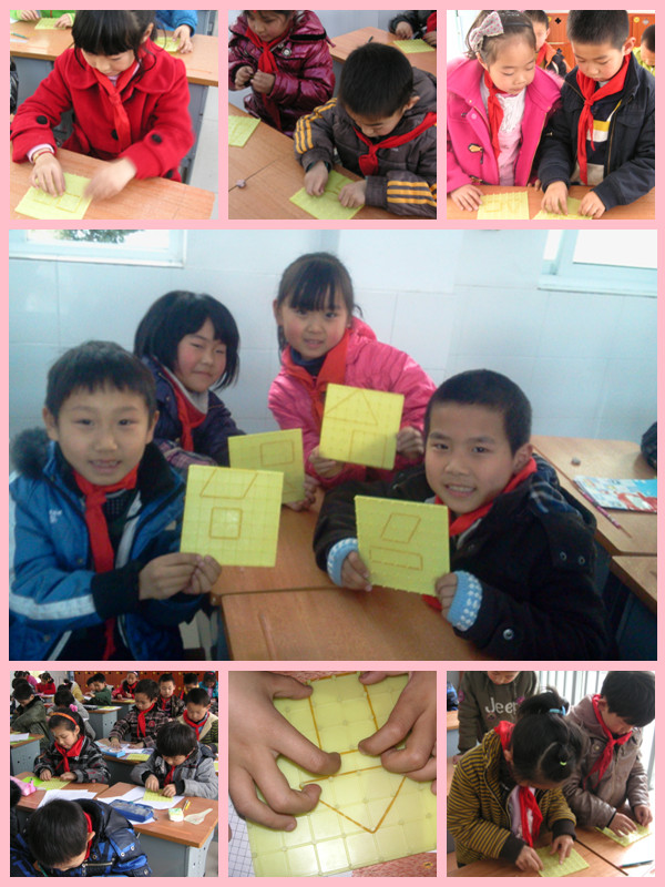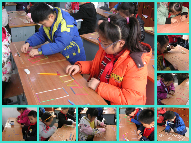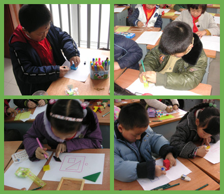 课堂上,孩子们利用身边的材料:白纸、积木、直尺、小棒、钉子板、点子图等,动手“做”图形,气氛非常活跃,俨然像个小小设计师。通过“做”图形——描、折、画、拼、围,让孩子进一步认识各种平面图形,加深了对图形的直观认识,感受了图形的变换与联系,发展了空间观念,为后续的学习夯实了基础。接着,师生一起寻找生活中的图形,体会现实生活中大量存在的这些图形,从而对数学学习产生积极的情感、态度与价值观。