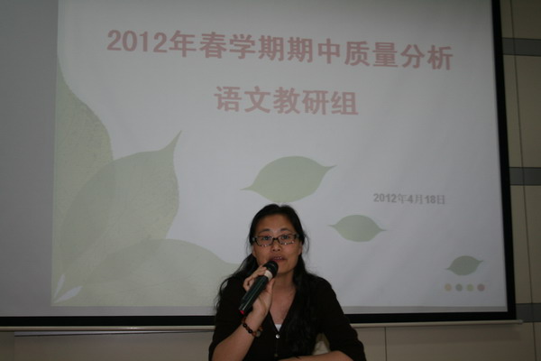 2012年4月18日下午,语文组的所有教师聚集一堂,就2012年期中质量分析展开研讨。李校长与姜校长全程参与了本次活动。