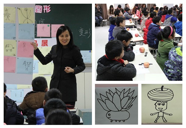 第二节课由新桥实验小学的万英华老师执教美术课《有趣的图形》,这是一节由三至六年级美术教材中创生出来的课。教师利用三年级学生敢于想象,没有过多思维定势的优势,鼓励学生通过变换角度,从外部到内部的观察方法,利用添加、变形等手法,从生活中的物体创生出一个个奇妙的新个体。万老师从学生整体发展角度考虑了“合理发挥想象”这一总体目标,还将它具体落实到了实际学习活动中去,学生的想象力获得了发展。