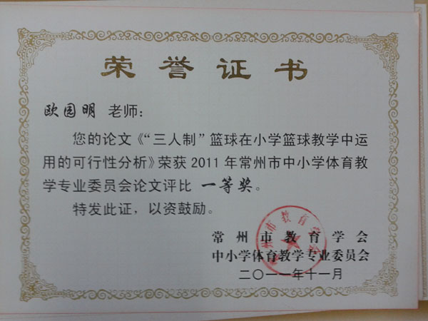 2011年11月欧园明论文《三人制篮球在小学篮球教学中运用的可行性分析》获常州市一等奖