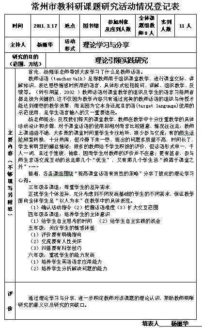 本表一般记录课题组集体活动的情况,由课题负责人及时登载。课题组成员的实验研究活动,由各课题组自行设计相应的登记表,定时检查后归类汇总填入本表相应栏目。