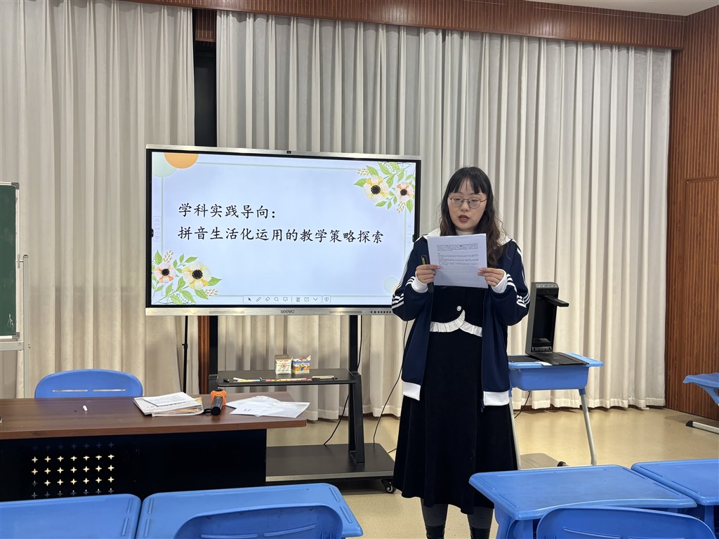 课后周可欣老师以“拼音生活化教学”为主题开展微型讲座。周老师提出通过创设情境、游戏互动等方式,将拼音学习与学生生活经验结合,从而提升拼读与运用能力,为识字与阅读奠定基础。