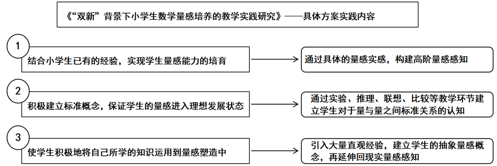 二、国内外研究现状和价值研究 (一)国内外研究现状 在国外,学者将量感视为融合感知、推理与应用的综合能力。Johnson & Smith从认知发展视角提出,量感的形成是大脑对数量信息处理、整合的动态过程。在教学实践研究方面,美国聚焦实践操作与生活联结,英国侧重数学思维培养,加拿大倡导合作探究。此外,国外研究多采用实验法、问卷法。在学段衔接与评价方面,国外构建了阶梯式培养路径。 在国内,新课标中关于“量感”的内容有了新的要求,注重度量意识、统一计量单位、量的意义,强调开展估测和度量活动。曹培英注重数与量的一致性和整体性,邵光华等人指出了在教学中培养量感的具体方法。黄红成认为要注重“计量教学”,即强调单位量在量感培养过程中的重要作用。 内涵上,国内外均否定“技能本位”认知,明确量感的综合素养属性,核心均指向对量的深层认知。价值上,均强调量感的桥梁作用与素养价值。策略上,国内外均以实践体验为核心路径,同时关注学段衔接,认可量感发展需遵循从感官感知到体系建构的阶梯式规律。 综上,基于“双新”背景下的量感研究甚少,系统性、阶梯式的量感培养路径尚未形成,量感培养仍然停留于理论研究层面,没有将其真正融入到课堂教学实践中,契合新课标理念、适配新教材内容的量感培养课堂教学模式没有形成。 (二)价值研究 1.丰富“双新”背景下小学生数学量感培养的校本化理论体系,更新并深化小学生数学量感培养的路径设计与教学策略。 2.为一线教师提供可操作性的量感教学培育方案,设计出契合新课标理念、适配新教材内容的量感培养课堂教学模式。 3.助力学生构建量感核心素养,为落实数学核心素养提供了可供参考的路径。 4.形成可复制的量感教学实践经验,为同类课题研究提供参考范式。